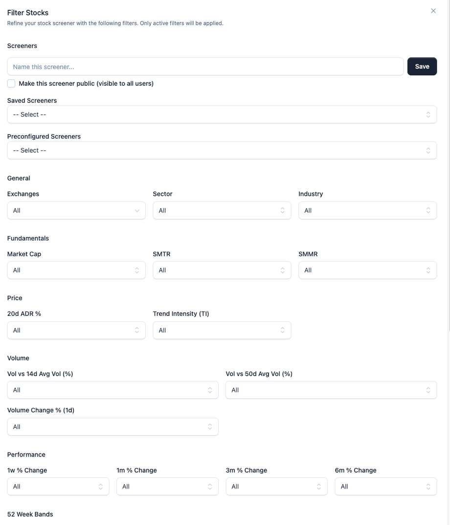 The screener filter dialog enables you to quickly narrow down a larger universe of stocks to only those that meet specific criteria you care about. Instead of manually checking hundreds of tickers, you can set filters such as price range, market cap, volume, technical indicators, and more and instantly get a focused list of candidates.