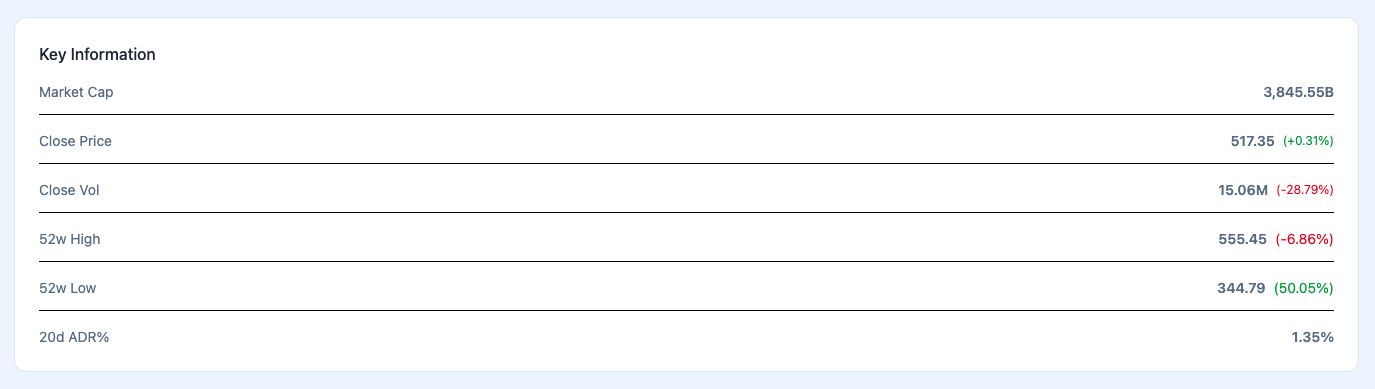 The next section provides key information about the stock including the latest market capitalisation, close price, close volume, 52w High and 52w low values and the 20 day Average Daily Range percentage (20d ADR%).