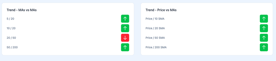 - MAs vs MAs - this will display a green up arrow if all moving averages are in correct order with the 10SMA, 20 SMA, 50 SMA and 200SMA aligned. If any are out of order then a red down arrow is displayed.