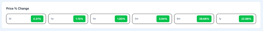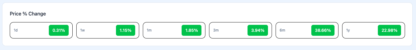 The price section provides percentage change (gain in green, loss in red) between latest price close and various timeframes - a day ago, week ago, 1 month, 3 months, 6 months and 1 year. Again this provides a quick view of a stocks growth and momentum.