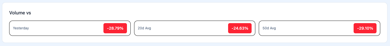 The volume section provides percentage change (gain in green, loss in volume) between latest volume close and several key measurements. These are yesterdays closing volume, the 20 day average volume and the 50d average volume.