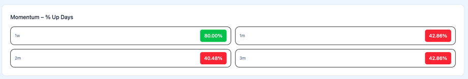 The momentum section displays the percentage of up/positive days over several different periods - past week, months, two months and three months. If the percentage of up-days is >= 50% then the background is green, else it's red. This provides you with a quick way to establish short and medium term momentum.