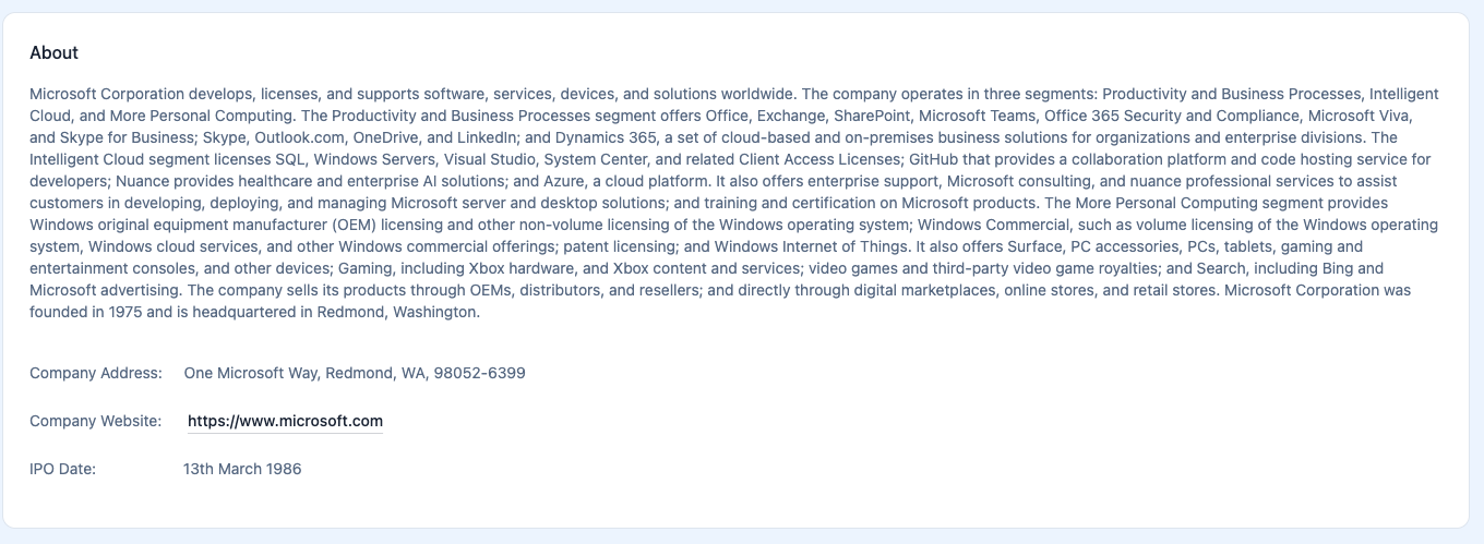 The about section provides a summary of the stocks key history and business areas. Also included are the companies address, link to its website and the IPO (initial public offering) date. This is the date when the stock was first listed on the stock exchange.