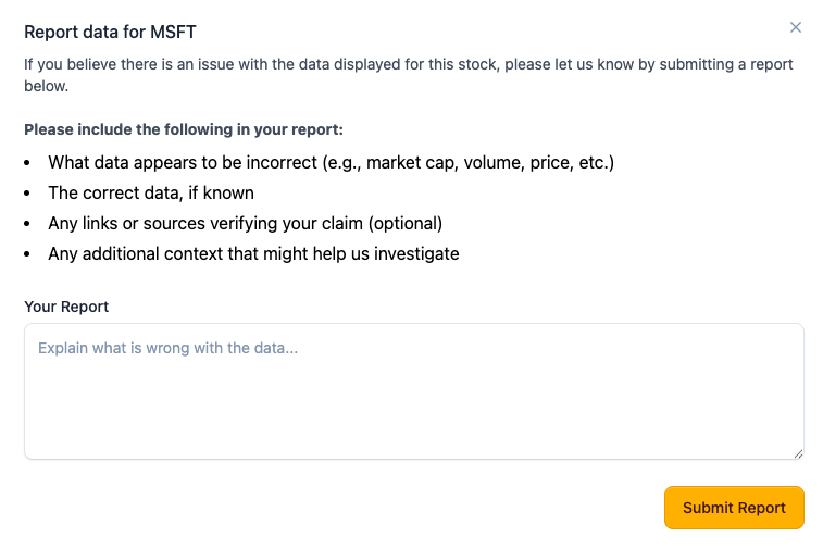 When viewing individual stocks, if you notice something that looks wrong — like missing information, incorrect stock details, or outdated data — you can report a data issue.